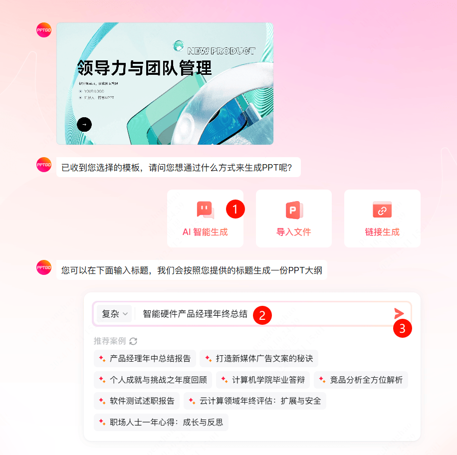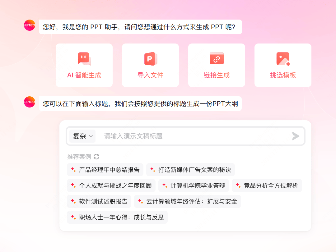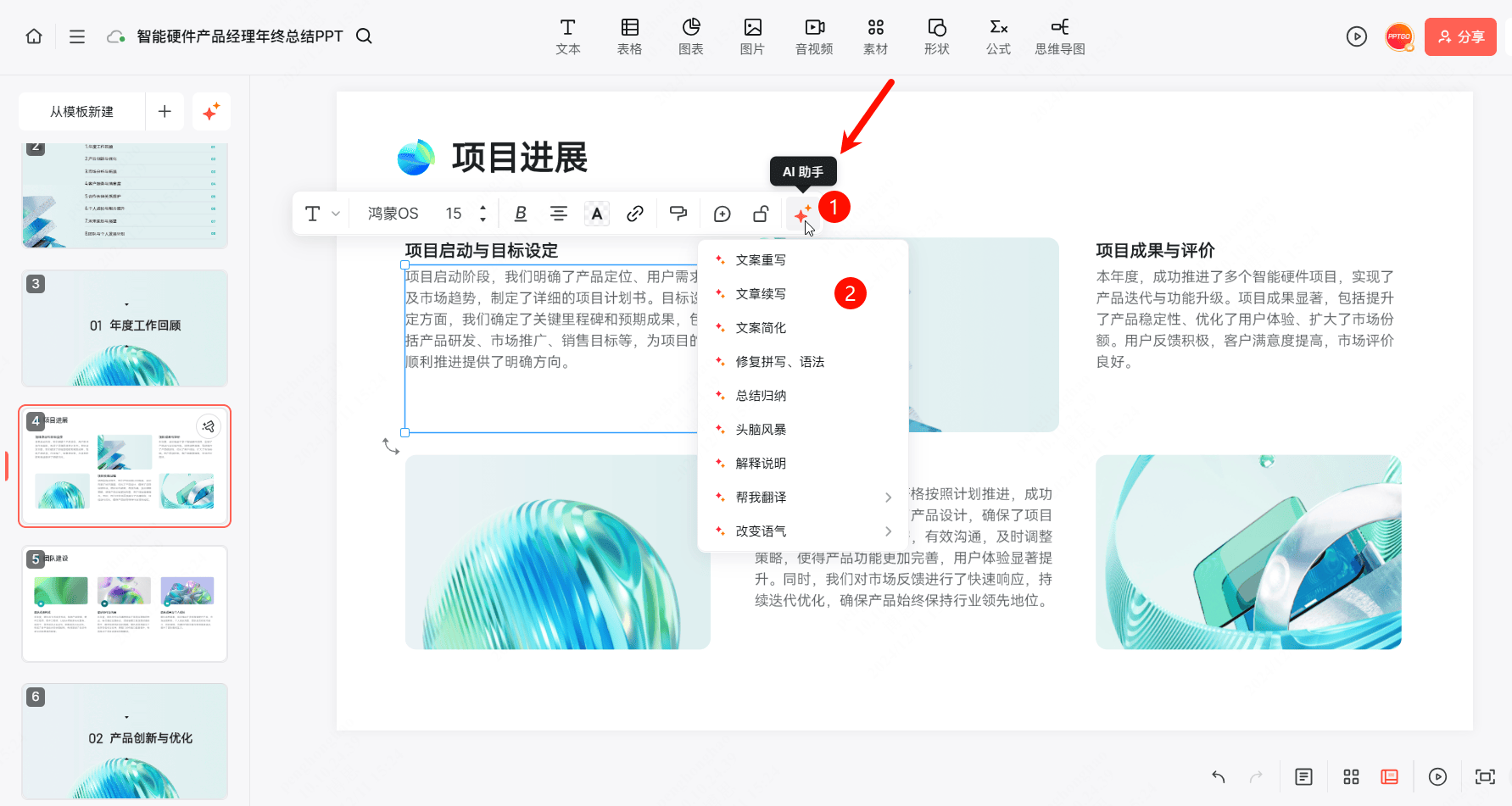 - 布局化纲领解析:用AI从动生成PPT纲领内容,选中PPT中的肆意一个文本框,同时供给多个选项,包罗AI生成思维导图、AI生成流程图、AI生成贸易画布、AI生成用户路程图、AI生成用户画像、AI生成SWOT阐发等。免费起头,让AI基于文档来生成年终总结PPT,涵盖AI写做、AI绘画、AI修图、AI翻译、AI素材生成等功能,这里小编选择“挑选模板”,且正在搜刮内容之前,取此同时,是正在线白板软件boardmix推出的AI智能帮手,可改换为文库、学术、图片和播客。就能又快又好地搞定年终总结PPT。筛选出所有可用于呈现一全年工做的PPT模板。正在此中输入思维导图从题,包罗智能生成PPT、导入文件生成PPT、链接生成PPT、自定义模板生成PPT等,就能快速获得一份高颜值的年终总结PPT。