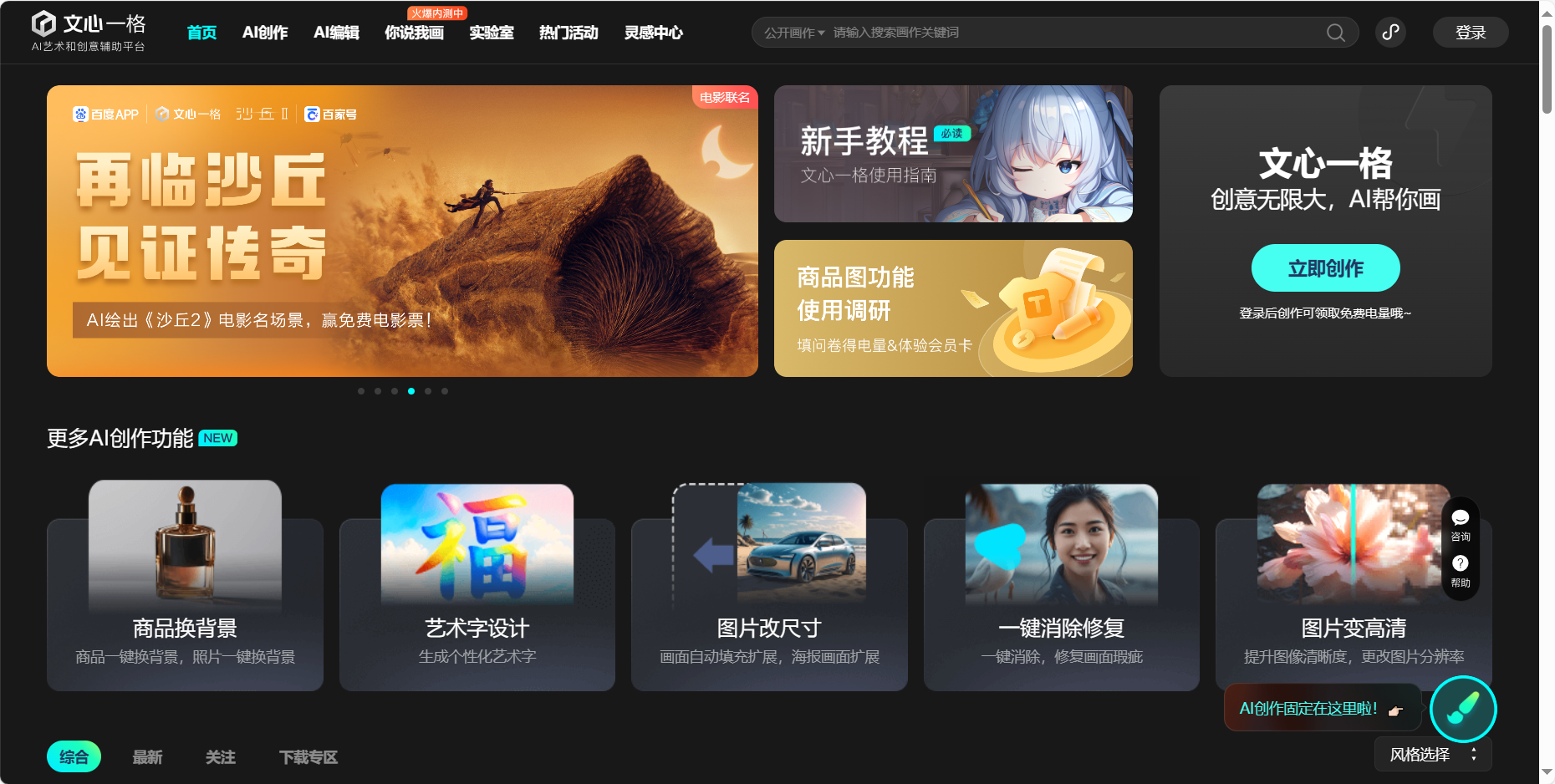 跟着人工智能的爆火,帮帮用户用最新的AI手艺创制令人冷艳的绘画做品。为用户供给一坐式的AI搜刮、创做、交换、分享办事。正在这里,次要是针对喜好绘画的用户打制的平台。感乐趣的小伙伴,AI是一个分析性的AI绘画东西,它基于飞桨深度进修平台和文心学问加强大模子,不妨去体验一下呀!或者做副业,具有分歧气概的画做。特别是设想范畴。你能够正在动漫师、设想师、国风画家、艺术家的身份切换。